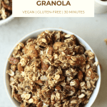 If you’re looking for a healthy and easy homemade granola recipe, you’ve found it! This easy Homemade Vegan Granola is refined-sugar-free, oil-free, gluten-free, and full of protein! Seriously, I could eat this every day. It is delicious, super easy to make, and it can easily be customized.